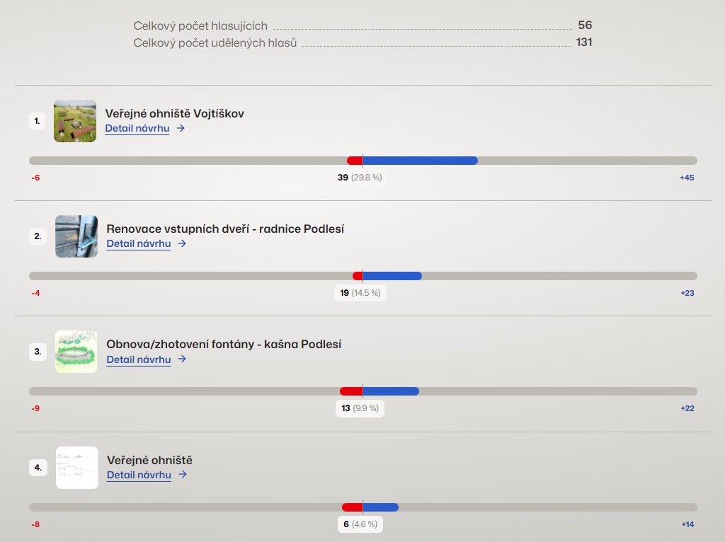 Sledujte průběžné výsledky a zjistěte, jak si jednotlivé návrhy vedou. Nezapomeňte, že váš hlas má skutečnou váhu a může rozhodnout o budoucnosti vaší obce. Níže uvádíme stav výsledku hlasování ke dni 3.11.2025.