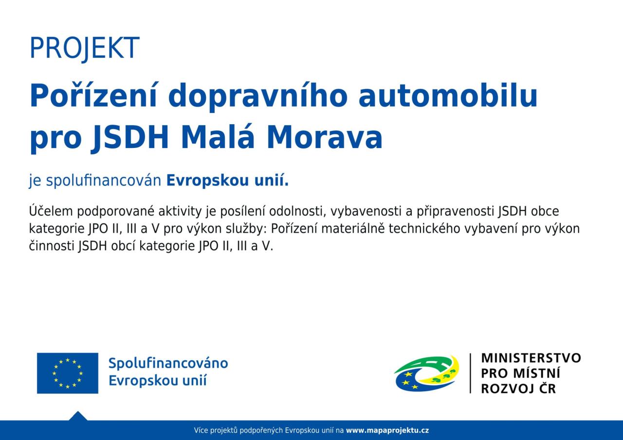 Obec Malá Morava s radostí oznamuje, že díky úspěšné žádosti o dotaci se Jednotka sboru dobrovolných hasičů dočká nového dopravního automobilu, který podstatně posílí její připravenost. Tento projekt, spolufinancovaný Evropskou unií, má za cíl zlepšit technické vybavení a akceschopnost jednotky. Nové vozidlo zajistí rychlejší a bezpečnější dopravu hasičů i potřebné techniky k zásahům, čímž se zlepší i pracovní podmínky dobrovolných hasičů. Díky této podpoře se zvyšuje úroveň ochrany zdraví, majetku a životního prostředí. Děkujeme všem, kteří přispěli k této důležité iniciativě.